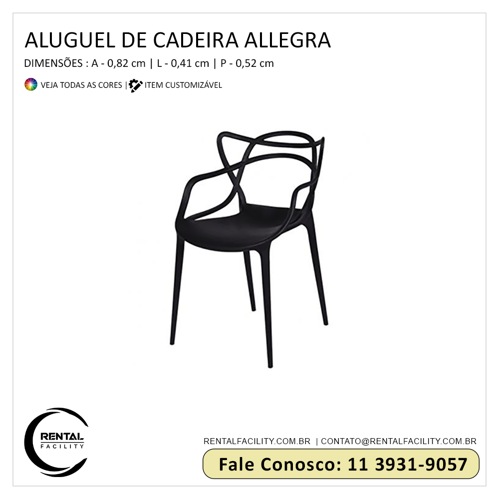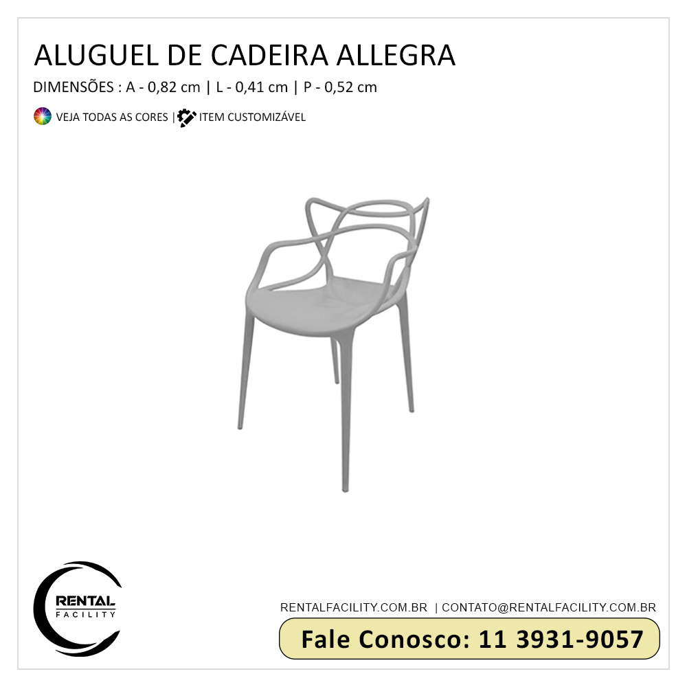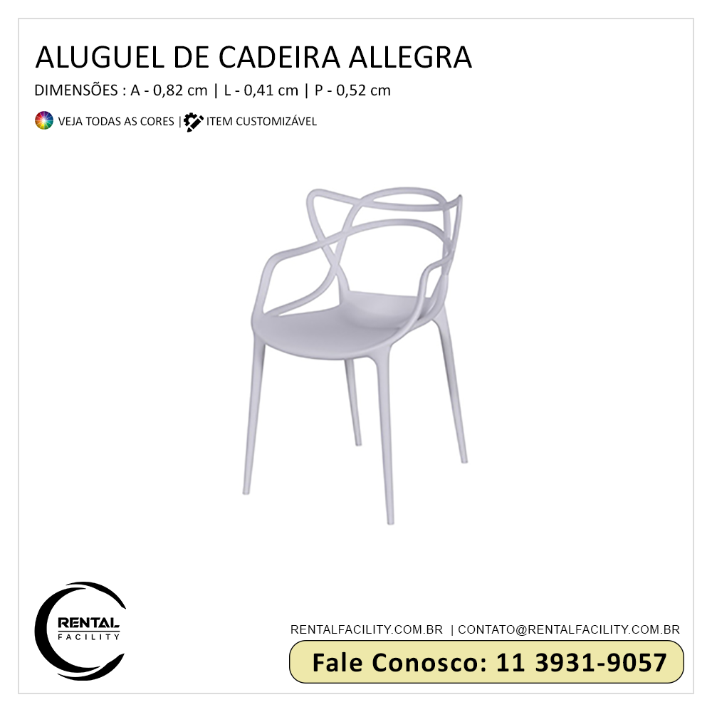 Tudo o que você precisa em locação de cadeiras Allegra para eventos corporativos e festas, a Rental Facility disponibiliza, incluindo o maior sortimento em locação de móveis dos mais variados tipos e modelos, incluindo cadeiras design,que sempre conferem requinte e distinção aos eventos sociais e empresariais.