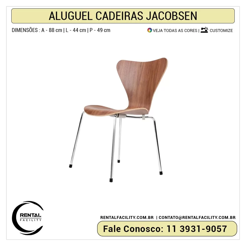 As cadeiras Jacobsen da Rental Facility, proporcionam à sua festa ou evento, uma enorme gama de alternativas por conta da imensa variedade de opções em cores, assim como, seu complementos em mesas e outros acessórios. Além desses modelo, Jacobsen também projetou outros modelo de sucesso como a cadeira, aluguel de Poltronas Swan e aluguel de Poltronas Egg, ambas as poltronas foram projetadas no ano de 1958, para o interior de um grande Hotel em Copenhague, que hoje são somados aos clássicos do design do século 20. Arne Jacobsen foi um dos primeiros a introduzir o conceito de Modernismo na Dinamarca.