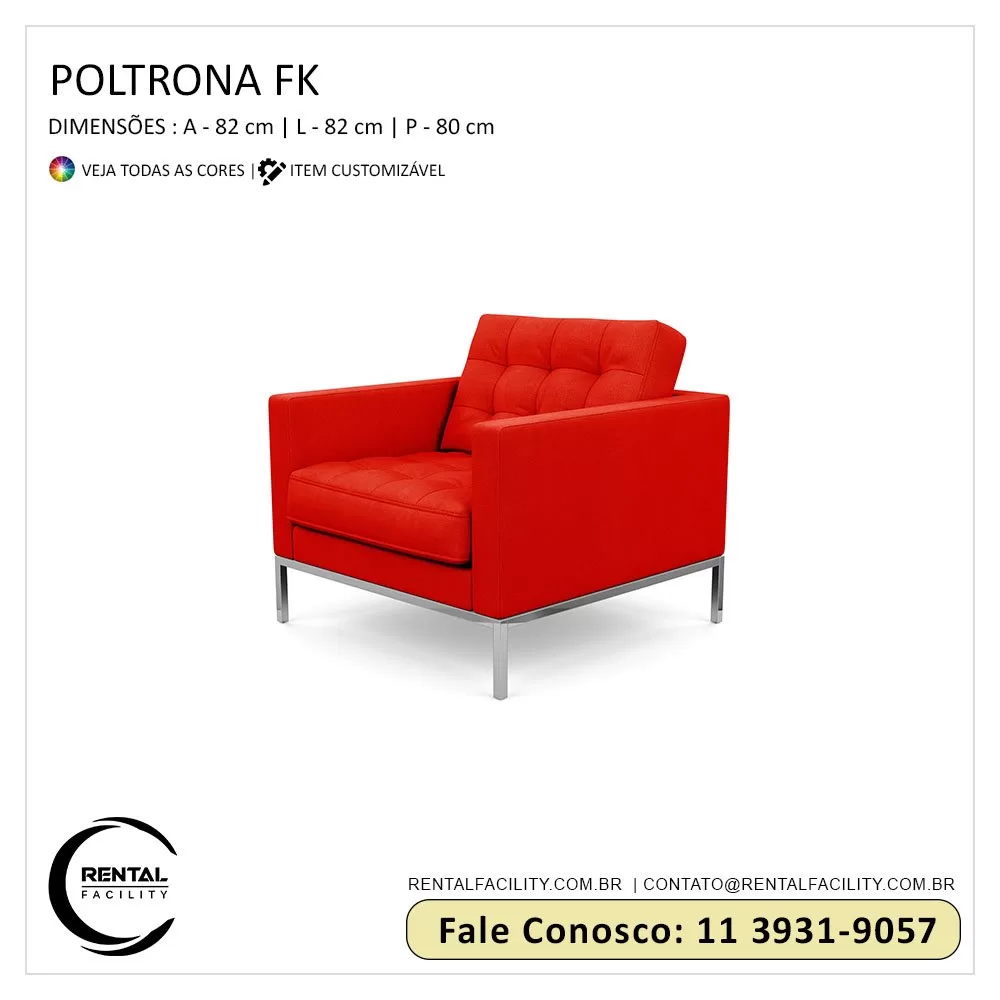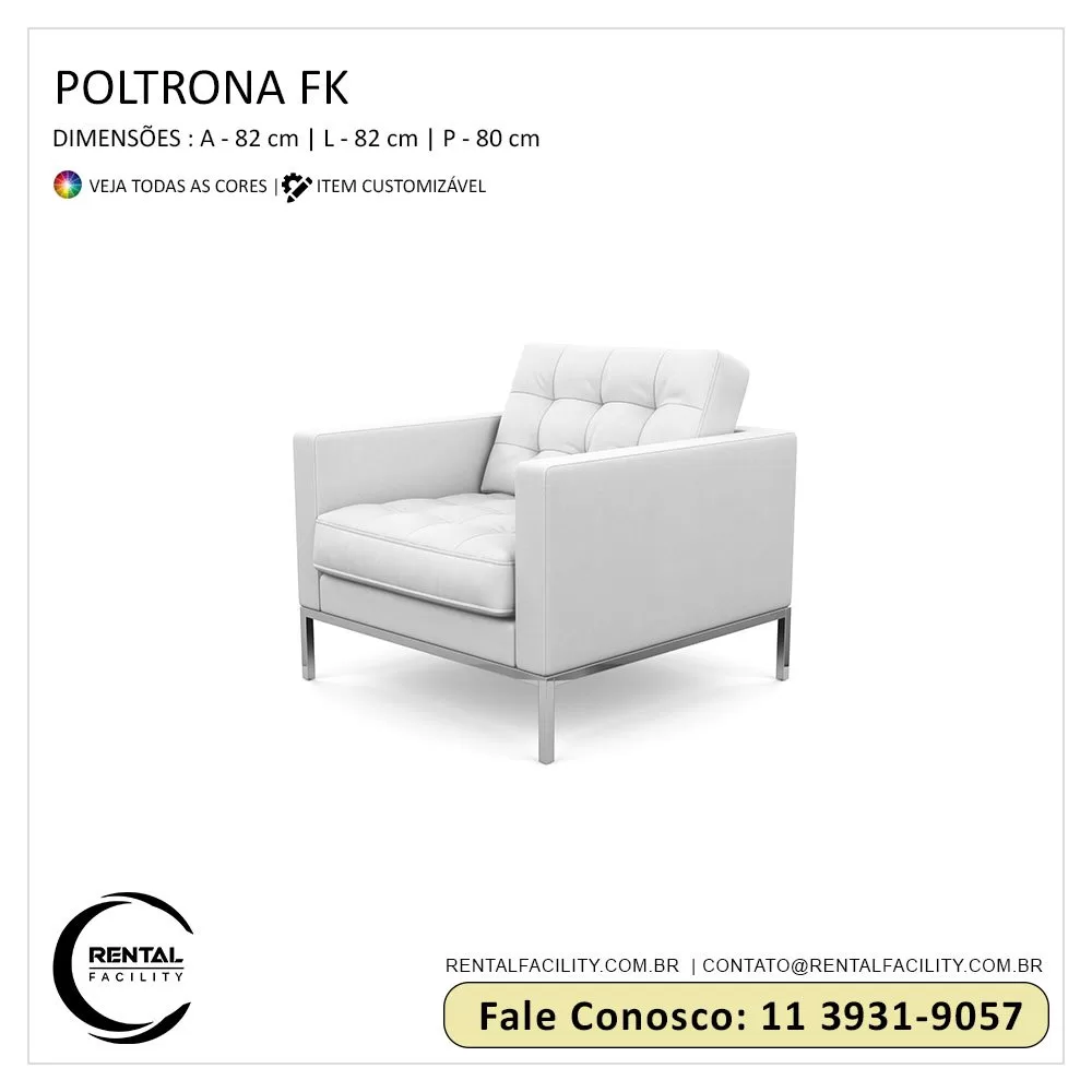 Essa é mais uma obra clássica e de luxo da Designer Florence Knoll. A Rental Facility trás o maior e melhor acervo de poltronas designs de todo o Brasil. As Poltronas FK são feitas com base de aço inox polido, estrutura em madeira, percintas elásticas sob assento, almofadas de espuma poliuretana revestida em tecido, couro ecológico ou couro natural de diversas cores e modelos.